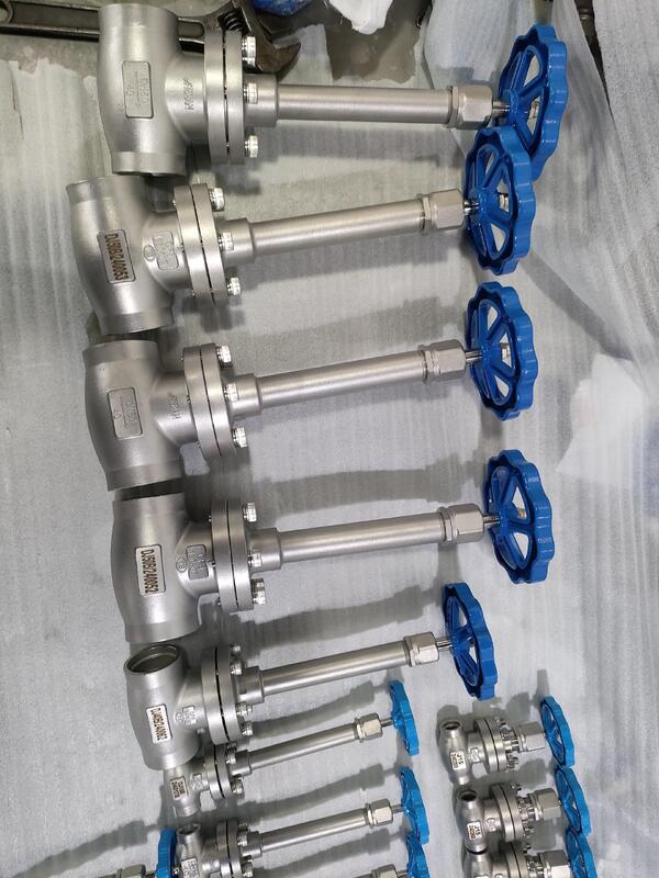 Válvula criogénica de globo manual de tallo largo, y el rango de temperatura de -196°C a +80°C Viene en tamaños de 3/8'-4' y está hecho de materiales PTFE, CF8 y CF3.,LIN,LAR,CO2